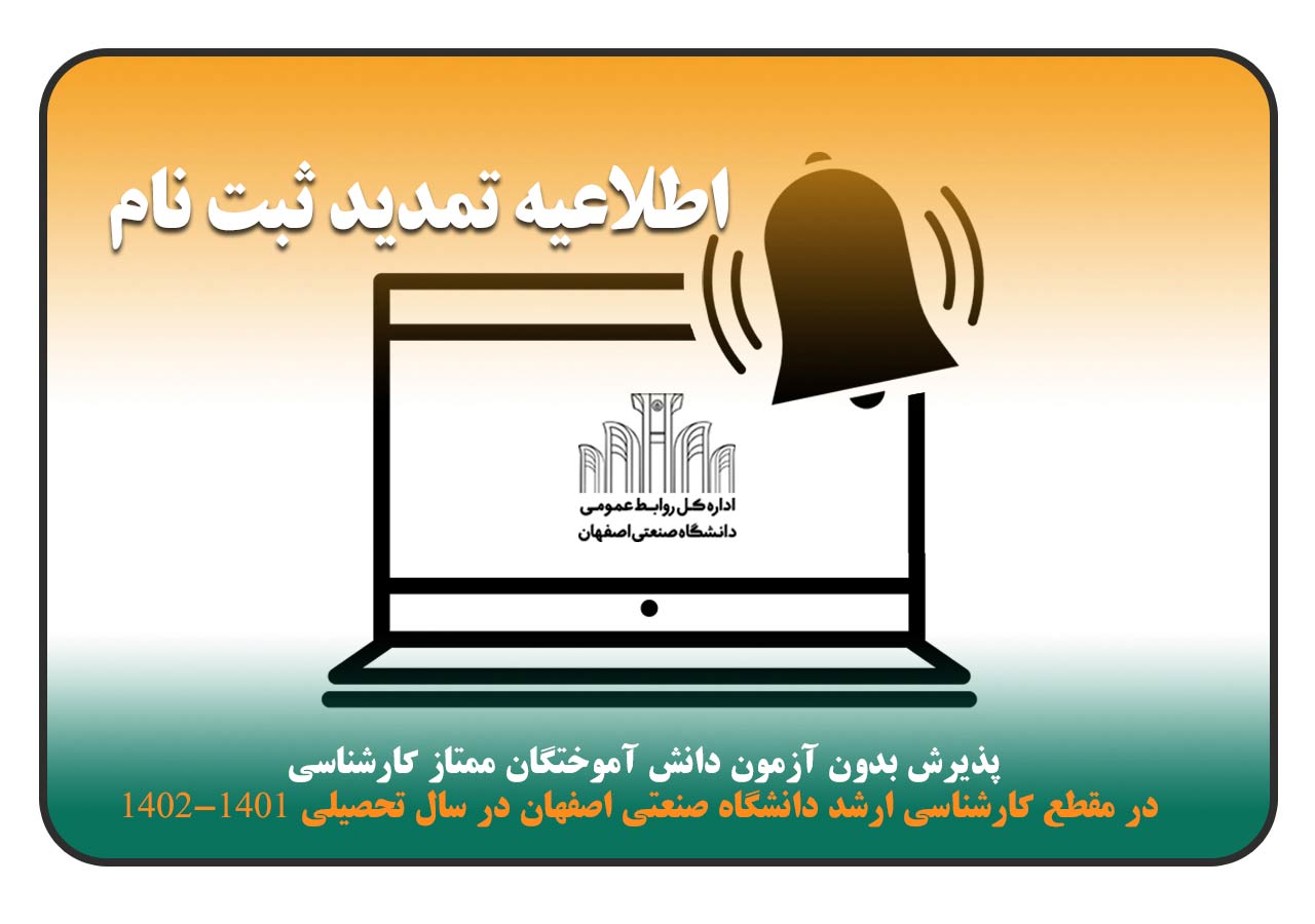 اطلاعيه تمديد ثبت نام پذيرش بدون آزمون دانش آموختگان ممتاز كارشناسي در مقطع كارشناسي ارشد دانشگاه صنعتي اصفهان در سال تحصيلي 1402-1401