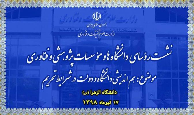 نشست رؤسای دانشگاهها و مؤسسات آموزشی، پژوهشی و فناوری کشور با موضوع «هماندیشی دانشگاه و دولت در شرایط تحریم»؛ ۱۷ تیرماه در دانشگاه الزهرا(س) برگزار میشود.