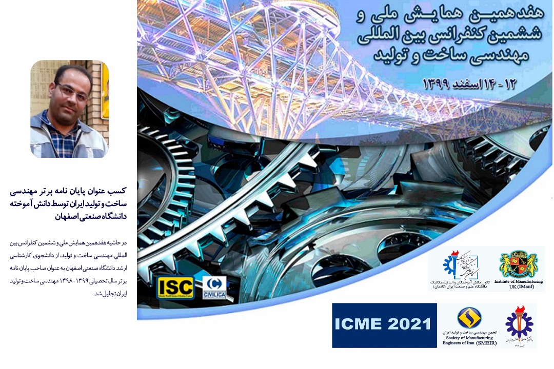 در حاشيه هفدهمین همایش ملی و ششمین کنفرانس بین المللی مهندسی ساخت و تولید، از دانشجوي كارشناسي ارشد دانشگاه صنعتي اصفهان به عنوان صاحب پایان نامه برتر سال تحصیلی 1398-1399 مهندسی ساخت و تولید ایران تجلیل شد.