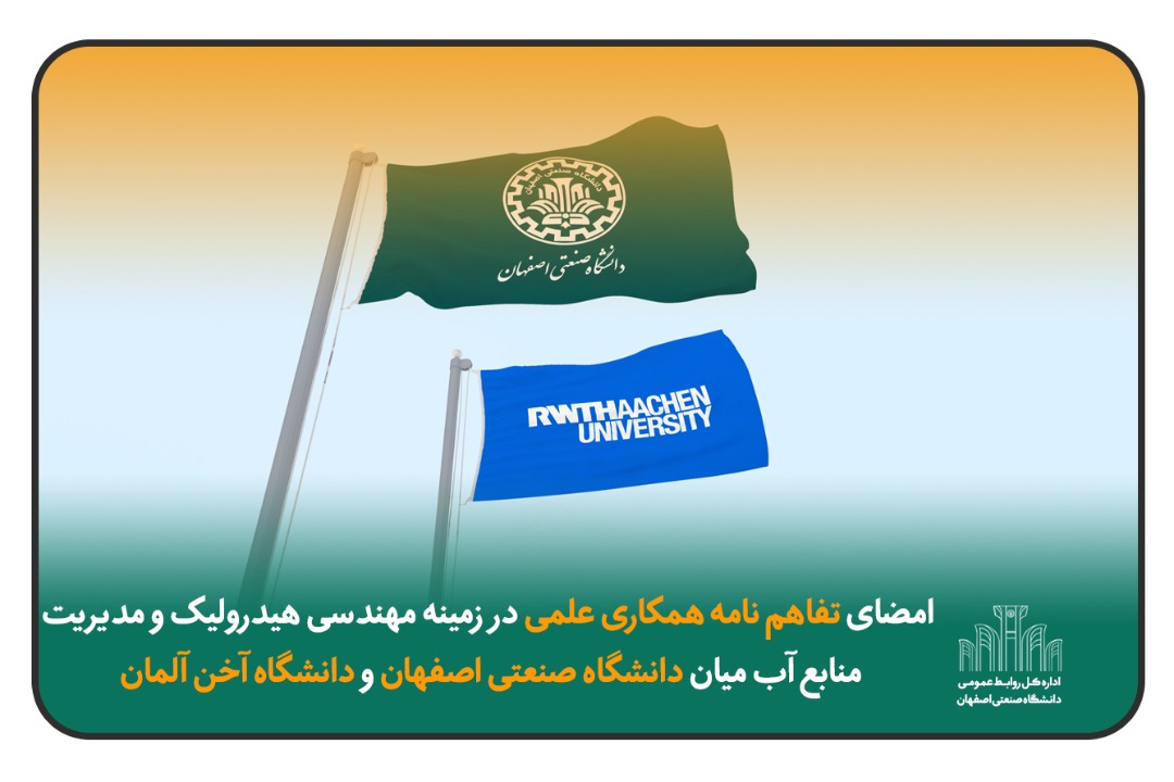 دكتر سيد سعيد اسلاميان گفت: اعضای قطب علمی مدیریت ریسک و بحران‌های طبیعی دانشگاه صنعتی اصفهان در نشستی با تأکید بر اهمیت افزایش همکاری‌های علمی بین ‌المللی در سطوح مختلف وگسترش تعاملات پژوهشی و آموزشی، تفاهم نامه همکاری با مؤسسه مهندسی هیدرولیک و مدیریت منابع آب(IWW)،  دانشگاه آخن(RWTH) با عنوان “استراتژی‌ها و فناوری‌های پایدار برای مدیریت خطر سیل در مناطق خشک و نیمه ‌خشک” را امضاء نمودند.