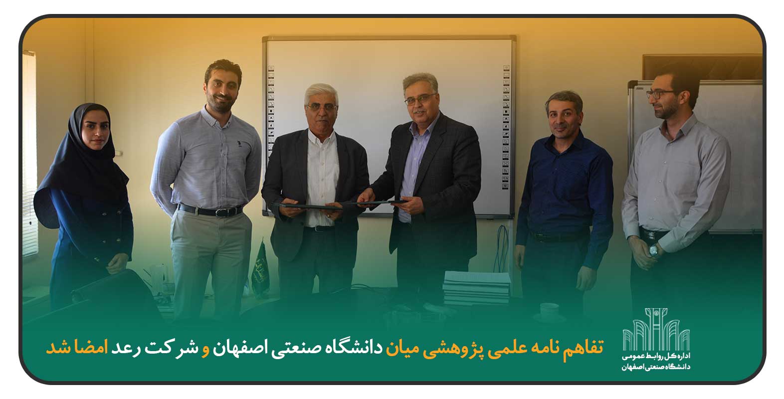تفاهم نامه همكاري دانشگاه صنعتي اصفهان و شركت رعد از شركت هاي فعال در حوزه تولیـد تجهیـزات برق صنعتـی،  با هدف توسعه ارتباطات علمي – پژوهشي ميان دانشگاه و بخش خصوصي با حضورمعاون پژوهش و فناوري دانشگاه و مديرعامل شركت رعد منعقد شد.