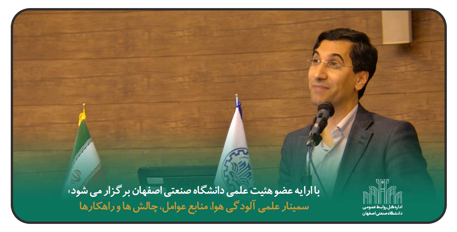 پنجمين سخنرانی از سلسله سخنرانی‌های بین‌رشته‌ای دانشگاه صنعتی اصفهان با موضوع بررسی «آلودگي هوا، منابع و عوامل، چالش ها و راهكارها» با ارايه دكتر محسن سليماني عضو هئيت علمي دانشكده مهندسي منابع طبيعي دانشگاه صنعتي اصفهان روز 27 مهرماه در تالار 8 دانشگاه صنعتي اصفهان و همچنين به صورت برخط برگزار می‌شود.