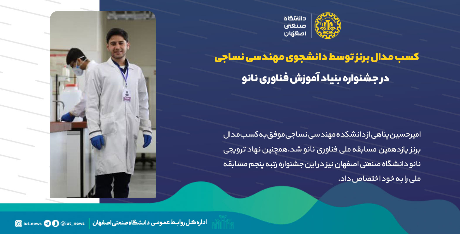 به گزارش اداره کل روابط عمومی دانشگاه صنعتی اصفهان امیرحسین پناهی از دانشکده مهندسی نساجی موفق به کسب مدال برنز یازدهمین مسابقه ملی فناوری نانو شد.همچنین نهاد ترویجی نانو دانشگاه صنعتی اصفهان نیز در این جشنواره رتبه پنجم مسابقه ملی را به خود اختصاص داد.