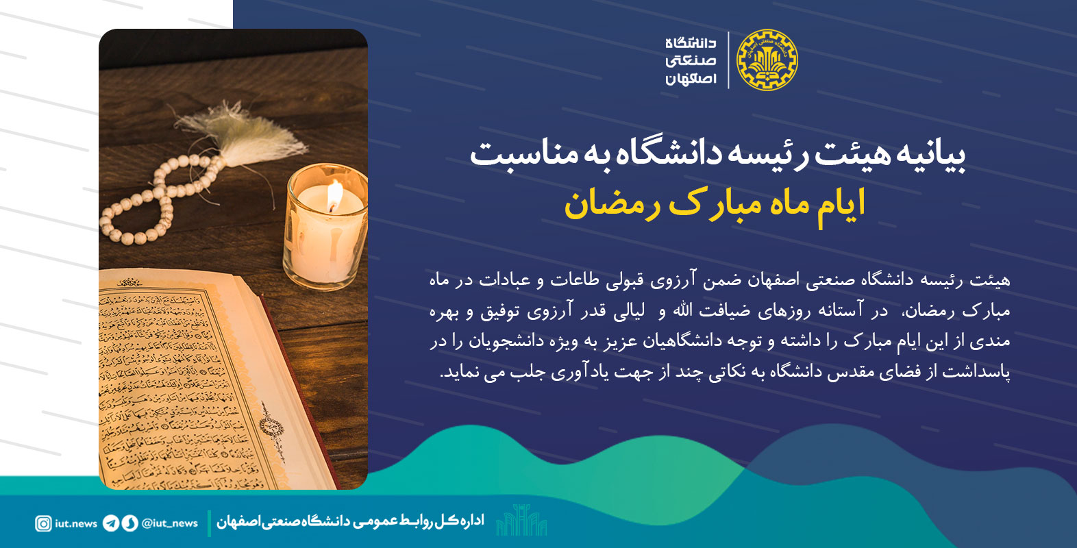 هیئت رئيسه دانشگاه صنعتي اصفهان ضمن آرزوی قبولی طاعات و عبادات در ماه مبارک رمضان،  در آستانه روزهای ضیافت الله و  لیالی قدر آرزوي توفیق و بهره مندي از اين ايام مبارك را داشته و توجه دانشگاهيان عزيز به ويژه دانشجويان را در پاسداشت از فضاي مقدس دانشگاه به نكاتي چند از جهت يادآوري جلب مي نمايد: