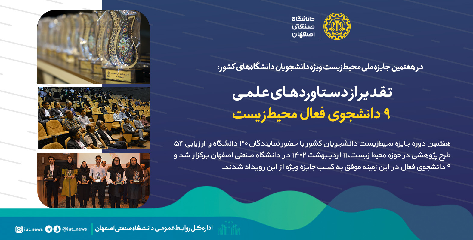 هفتمین دوره جایزه محیط‌زیست دانشجویان کشور با حضور نمایندگان 30 دانشگاه و ارزیابی 54 طرح پژوهشی در حوزه محیط زیست، 11 اردیبهشت 1402 به میزبانی دانشکده مهندسی منابع طبیعی دانشگاه صنعتی اصفهان برگزار شد و 9 دانشجوی فعال در این زمینه موفق به دریافت جایزه ویژه از این رویداد شدند.