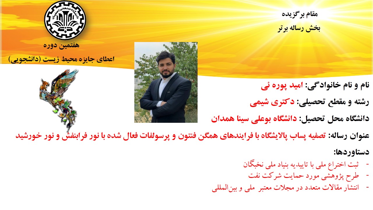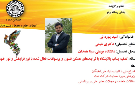 از جمله طرح های برگزیده معرفی شده در این دوره می توان به طرح برگزیده امید پوره ئی، دانشجوی دکترای شیمی، دانشگاه بوعلی سینا همدان اشاره کرد که موفق به کسب عنوان مقام برگزیده در بخش رساله برتر شد. این طرح با عنوان تصفیه پساب پالایشگاه با فرایندهای همگن فنتون و پرسولفات فعال شده با نور فرابنفش و نور خورشید، موفق به کسب افتخاراتی همچون ثبت اختراع ملی با تاییدیه بنیاد ملی نخبگان، طرح پژوهشی مورد حمایت شرکت نفت و انتشار مقالات متعدد در مجلات معتبر  ملی و بین‌المللی، شده است.