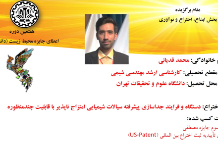 مقام برگزیده در بخش ابداع، اختراع و نوآوری به محمد قدیانی  دانشجوی کارشناسی ارشد مهندسی شیمی از دانشگاه علوم و تحقیقات تهران اعطا شد. که موفق به اختراع دستگاه و فرایند جداسازی پیشرفته سیالات شیمیایی امتزاج ناپذیر با قابلیت چندمنظوره شده است.   این طرح پیش از هم توانسته است رتبه سوم جایزه مصطفی را بدست آورد و دارای تأییدیه ثبت اختراع بین المللی (US-Patent) است.