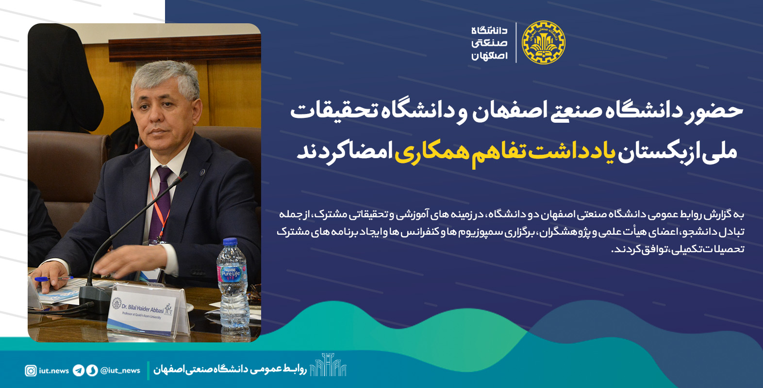 دانشگاه صنعتی اصفهان و موسسه مهندسین آبیاری و مکانیزاسیون کشاورزی تاشکند در دانشگاه تحقیقات ملی (ازبکستان) یادداشت تفاهم همکاری را با یکدیگر امضا رساندند. این تفاهم نامه میان دکتر میبدی، رئیس دانشگاه صنعتی اصفهان و بخادیر میرزایف رئیس دانشگاه ملی تحقیقات TIIAME ازبکستان منعقد شده است.