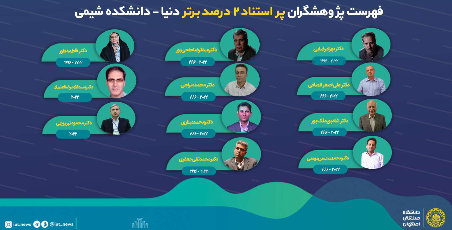 دکتر اصغر غلامی مدیر پژوهشی دانشگاه صنعتی اصفهان با بیان این خبرگفت: اين پايگاه از سال 2019 تاكنون دو فهرست از پژوهشگران پراستناد دو درصد برتر جهان  منتشر مي كند. تفاوت اين دو فهرست در بازه زماني استنادهاي تحليل شده است؛ در يكي از فهرست هاي اعلام شده، بازه زماني استنادهاي دريافتي يك ساله است ودر  فهرست ديگر، بازه زماني استنادهاي دريافتي از سال 1996 تا سال 2022 در نظر گرفته شده است.