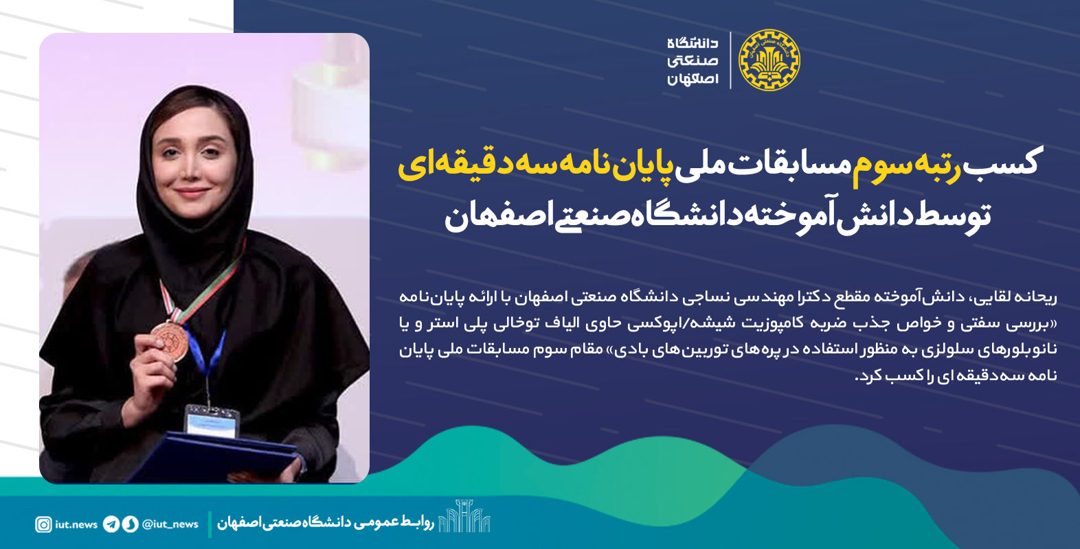 ریحانه لقایی، دانشآموخته مقطع دکترا مهندسی نساجی دانشگاه صنعتی اصفهان با ارائه پایاننامه «بررسی سفتی و خواص جذب ضربه کامپوزیت شیشه/اپوکسی حاوی الیاف توخالی پلی استر و یا نانوبلورهای سلولزی به منظور استفاده در پرههای توربینهای بادی» مقام سوم مسابقات ملی پایاننامه سهدقیقه ای را کسب کرد.